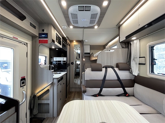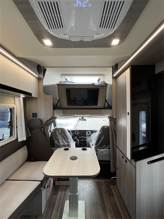 车内起居区,部分科技灰色环保板搭配米色柔和风格,带来高端轻奢家居氛围感。L型卡座接待区还可以作为用餐区、前额床、中央厨房、后母床(或后纵床)和一体式卫生间。前后床、驾驶室、L型沙发卡座左侧和后床左侧均配有私人窗帘,有效保证旅途中的私密性。全车采用进口真皮软包,使用起来非常舒适,打理方便。