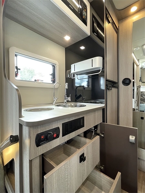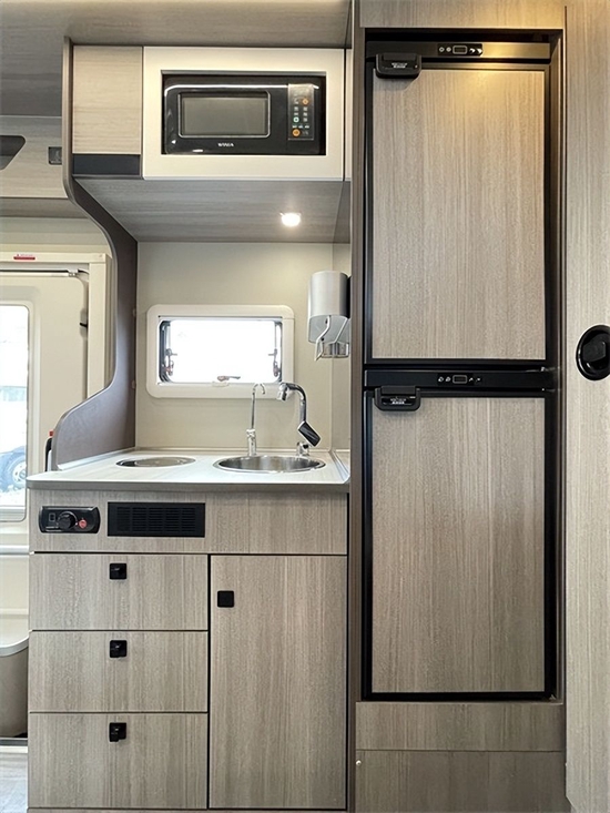 厨房区位于车的中间。配备志高电磁炉、不锈钢洗脸盆等,上下多个储物柜,储物空间充足;周围一组220V电源插座可以给手机等小电器充电。房车旅行最重要的方面是舒适,车内充足的空间是必不可少的。C530大玩家定制版房车内部空间很大,整体布局非常合理。驾驶室、卧室区、客厅、浴室、厨房等功能区一应俱全。