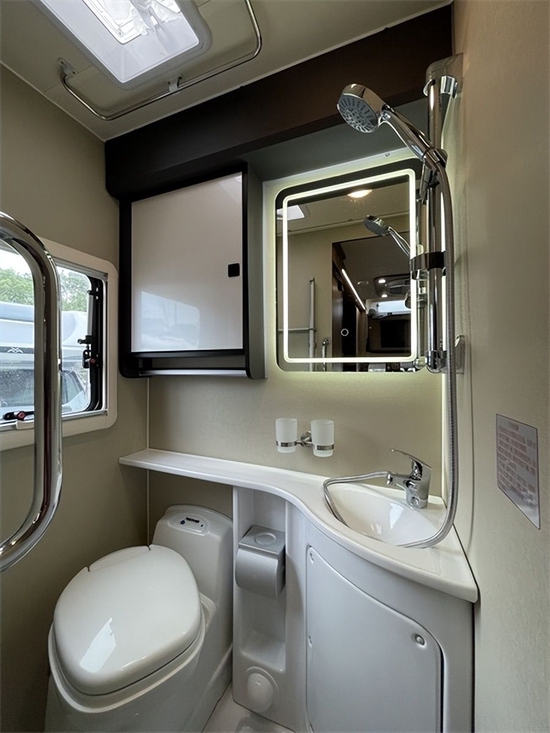 卫生间的空间还是不错的,可以满足大人的正常洗涤。配置也基本齐全,主要包括移动马桶、淋浴间、置物架、毛巾架、化妆镜和顶部换气扇。但是它没有配备洗脸盆,这个可以支持选配。毕竟这是宇通房车制造的房车,您可以享受到宇通优质的售后服务。目前这款房车官方指导价39.80000,赠送原厂800AH锂电池